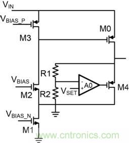 圖4:具有電阻式分壓器、M4位于放大器反饋環路、無輸出電容器的 LDO