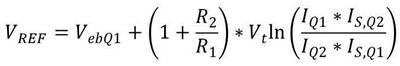 其中VEB是Q1的基射極間電壓,VT是熱電壓,IQ1和IQ2是通過晶體管Q1和Q2的電流,而 IS,Q1和IS,Q2則分別是Q1和Q2的飽和電流。