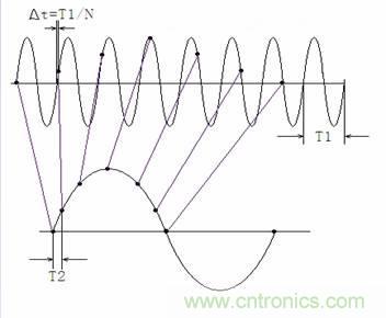 可以看到,等效采樣方法在輸入信號(hào)一個(gè)周期內(nèi)僅采樣一個(gè)點(diǎn)且每個(gè)周期采樣的相位有遞增關(guān)系(圖1中△t),調(diào)整這個(gè)遞增相位可以達(dá)到調(diào)整相位分辨率的目的。