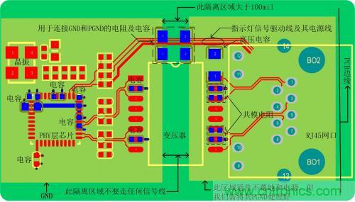 e)變壓器的兩邊需要割地:即RJ45連接座和變壓器的次級(jí)線圈用單獨(dú)的隔離地,隔離區(qū)域100mil以上,且在這個(gè)隔離區(qū)域下沒有電源和地層存在。這樣做分割處理,就是為了達(dá)到初、次級(jí)的隔離,控制源端的干擾通過參考平面耦合到次級(jí);