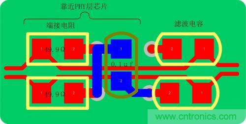 c)差分信號(hào)終端電阻(49.9Ω,有的PHY層芯片可能沒有)必須靠近PHY層芯片的Rx±、Tx±管腳放置,這樣能更好的消除通信電纜中的信號(hào)反射;
