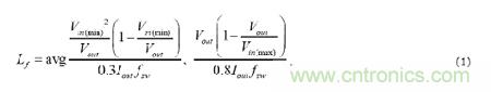 電感取決于輸入電壓范圍和目標峰值到峰值電感器紋波電流比。方程式1分別設定了30%和80%時,深度升壓和深度降壓運行點內的目標紋波電流比。