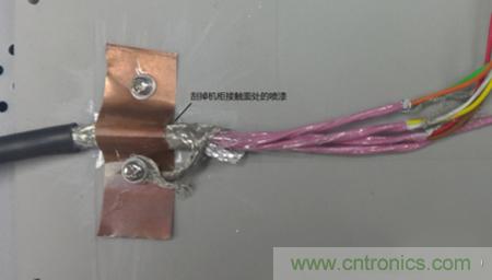 從安全方面考慮,三個機柜都必須接大地,強電線路與信號線分開避免干擾這些都是要遵循的基本原則。實際機柜間位置較遠,接地對于高頻干擾改善不多,只作為安全措施。解決這種問題一般考慮是從干擾源、傳播路徑、敏感設(shè)備三方面著手。驅(qū)動器和功率分析儀是成型的設(shè)備,不便于改動,考慮從傳播路徑入手,使用多芯屏蔽電纜連接扭矩傳感器到測控柜,傳感器端屏蔽層連接到傳感器外殼,也與電機平臺連通,另一側(cè)屏蔽層接到測控柜機殼。最初的時候屏蔽層通過一根較長的線連接到測控柜,發(fā)現(xiàn)并沒有改善,最后使用銅片將整根線壓到機柜,干擾得到很大衰減。