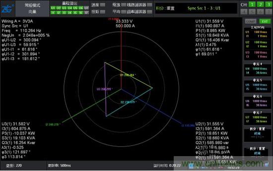 此時將系統(tǒng)運行起來,通過功率分析儀的數(shù)據(jù)和波形再次進行驗證,電壓波形圖和矢量圖都很完美。