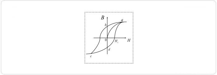 一般磁性材料都有S形狀曲線的特性,稱之為磁滯回路(hysteresis loop),如圖2所示。此磁滯回路曲線建立在B—H的坐標(biāo)軸上,為磁性材料遭受完全磁化與非磁化周期,圖示為典型磁滯曲線的鐵心,如果曲線由a點(diǎn)開始,此點(diǎn)表示最大正磁化力,至b點(diǎn)磁化力為零,然后下降至c點(diǎn)為最大負(fù)磁化力,再至d點(diǎn)磁化力為零,最后返回最大正磁化力的a點(diǎn),此即為整個(gè)磁性周期。高導(dǎo)磁率、低矯頑力磁芯的磁滯回線如圖3所示。