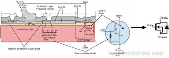 至于為什么不使用耗盡型的MOS管,不建議刨根問底。對于這兩種增強型MOS管,比較常用的是NMOS。原因是導通電阻小且容易制造。所以開關電源和馬達驅動的應用中,一般都用NMOS。下面的介紹中,也多以NMOS為主。在MOS管原理圖上可以看到,漏極和源極之間有一個寄生二極管。這個叫體二極管,在驅動感性負載(如馬達),這個二極管很重要。順便說一句,體二極 管只在單個的MOS管中存在,在集成電路芯片內部通常是沒有的。下圖是MOS管的構造圖,通常的原理圖中都畫成右圖所示的樣子。 (柵極保護用二極管有時不畫)