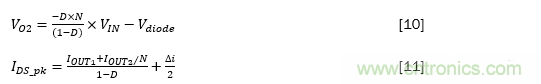 其中VIN是輸入電壓,VO2是次級輸出電壓,Vdiode是二極管正向壓降,D是占空比,N是變壓器匝數比,Ids_pk是通過頂部開關的峰值電流,△i是主電感器紋波電流的三角部分,IOUT1和IOUT2分別是由VO1和VO2,生成的輸出電流。