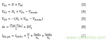其中VO1是主輸出,VO2和VO3分別是正和負次級輸出,D是占空比,N1和N2分別是與VO2和VO3對應的變壓器的匝數比。Vdiode是二極管的正向壓降,IOUT1、IOUT2和IOUT3分別是由VO1、VO2和VO3生成的輸出電流,Ids_pk是通過頂部開關的峰值電流,△i是主電感器紋波電流的三角部分。