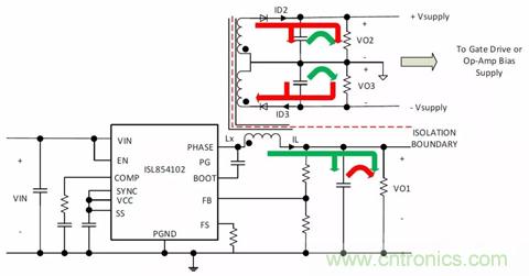 圖4. 生成3個輸出的隔離式降壓拓撲:2個+VOUT和1個-VOUT軌(ISL854102DEMO2Z)