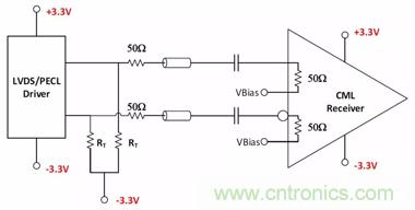圖14顯示了LVDS/PECL驅動器至CML接收器接口的框圖。