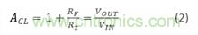 等式中A_CL是閉環增益,R_F 是反饋電阻值,而R_2 是從負輸入端到信號(反相)或接地(非反相)的電阻值。