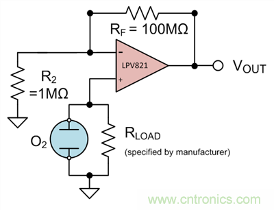 用氧氣傳感(見圖 3) 作為具體的應用實例,假設感應器的最大輸出電壓為10mV(通過制造商指定的負載電阻將電流轉換成電壓R_L) ,則運算放大器的滿量程輸出電壓為1V。通過Equation 2,可以看出 A_CL  的值需要為100,或者R_F是R_2的100倍。分別選擇100MΩ電阻和1MΩ電阻,得出增益值為101,且電阻值足夠大到可以限制電流并最小化功耗。