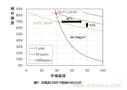 從上圖可以看出,相對濕度增加11%或者溫度增加40℃,都會造成壽命從1000年減為30年,所以,相對來說,相對濕度的影響比溫度影響更大。一般來說,當變流器內部升溫時,絕對濕度會保持不變。如果環境條件從溫度38.9℃、相對濕度83.0%變為溫度42.6℃、相對濕度68.8%,但是絕對濕度值保持40g/m3,壽命會從30年增加到1000年。所以,預加熱是一種非常有效的抑制濕度失效的方法。