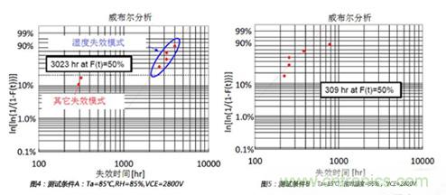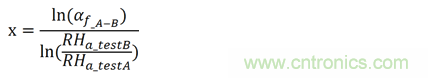 如圖4所示,在測試條件A的平均壽命為3023個小時。同樣,如圖5所示,在測試條件B的平均壽命為309個小時。所以,從相對濕度85%到相對濕度95%,加速因子αf_A-B通過計算為3023/309=9.78。相對濕度的經驗影響因子x通過下式計算:
