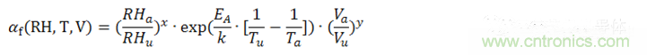 公式中,αf為測試的加速因子,也就是加速(后綴為a)測試條件下MTTF(Mean Time To Failures,平均無故障時間)與參考(后綴為u)測試條件下MTTF之比。EA是活化能,在0.79eV和0.95eV之間,k為玻爾茲曼常數。指數x為相對濕度的影響,指數y為電壓的影響,都是經驗數據,但是必須通過實際評估來確認。我們把此加速模型擴展到壽命預估模型中。