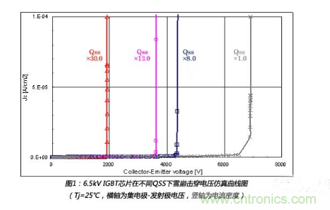 一般來說,擊穿電壓會隨著IGBT芯片邊緣電荷量QSS的增加而降低。圖1為6.5kV 高壓IGBT芯片的擊穿電壓隨著QSS變化的曲線圖。高濕度工況下的失效機理如下所述。