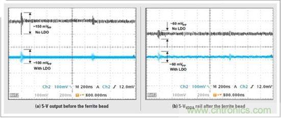 實驗 3—使用 TPS5420,從 10-V 實驗室電源生成一個 5-V 電壓軌。本實驗中, 我們繞過了 TPS79501 低噪聲 LDO。圖 3a 表明,如“實驗 2”連接的 LDO 較 好地減少了開關穩壓器的 5.3-V 輸出峰值電壓。但是,圖 3b 表明 5-VVDDA 電壓軌鐵氧體磁珠之后輸出沒有巨大的差異。