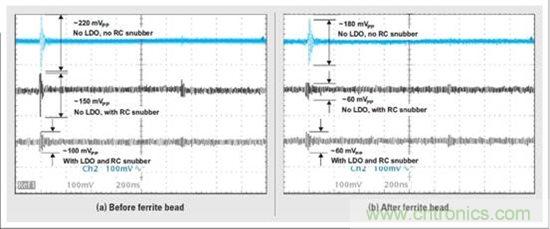 圖 11 鐵氧體磁珠后測得 3.3-VVDDA 電壓軌實驗示波器截圖對比