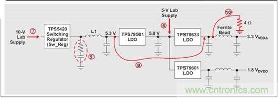 實驗 6—將一個 5-V 實驗室電源連接到兩個低噪聲 LDO(一個使用 3.3-V 輸 出,另一個使用 1.8-V 輸出)的輸入。LDO 并未給實驗室電源帶來任何有影響 的噪聲。實驗 7—將一個 10-V 實驗室電源連 接到 TPS5420 降壓穩壓器,其與 一個5.3-V 輸出連接,像“實驗 2”連接 ADS5483 一樣。TPS79501 生成了一個過濾后的 5.0-V 電壓軌,其向 3.3-V 輸出和 1.8-V 輸出 LDO 提供輸入,如圖 10所示。 實驗 8—所有 3.3-VVDDA 電壓軌 LDO 均被繞過。TPS5420 配置為一個 3.3-V 輸出,該輸出直接連接到 3.3-VVDDA 電壓軌。TPS79601 生成 1.8-VDVDD 電壓軌, 并通過一個外部 5-V 實驗室電源供電。