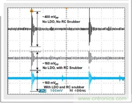 圖 11 顯示了“實驗 7”、“實驗 8”和“實驗 9”產生的一些 3.3-VVDDA 輸出波 形。有或無 LDO 的峰值電壓振幅存在一些差異,但 RC 緩沖器可降低 60% 的 峰值噪聲。