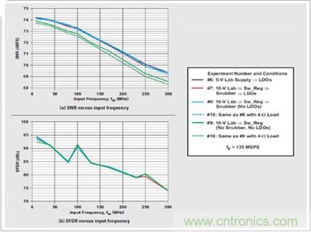 5 次實驗的結構變化配置如下: 實驗 1—一個 5-V 實驗室電源直接連接到 5-V 模擬輸入,同時繞過開關穩壓器(TPS5420) 和低噪聲 LDO (TPS79501)。使用一個板上 LDO(TI 的 TPS79633)生成 ADS5483 低敏感度 3.3-V 模擬及數字電源的 3.3-V 電壓軌。