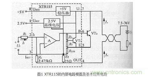 XTR115采用SO-8小型化封裝,其內(nèi)部電路框圖及基本應(yīng)用電路如圖1所示。U+為電源端,接環(huán)路電源。UREF為2.5V基準電壓輸出端。II端接輸入電流。IRET為基準電壓源輸出電流和穩(wěn)壓器輸出電流的返回端,可作為輸入電路的公共地。OUT為4~20mA電流輸出端。UREG為+5V穩(wěn)壓器的輸出端。B和E端為外部功率管的接口,分別接功率管的基極(B)和發(fā)射極(E)。功率管的集電極(C)接U+端。芯片內(nèi)部主要包括輸入放大器(A),電阻網(wǎng)絡(luò),輸出晶體管(VT1),2.5V基準電壓源和+5V穩(wěn)壓器。RLIM為內(nèi)部限流電阻。外圍元器件主要有輸入電阻(RI),功率管(VT2),環(huán)路電源(Us)和負載電阻(RL)。輸入電壓UI先經(jīng)過RI轉(zhuǎn)換成輸入電流II,再經(jīng)過XTR115放大后從OUT端輸出4~20mA的電流信號。為減小失調(diào)電壓以及輸入放大器的漂移量,要求UI》0.5V
