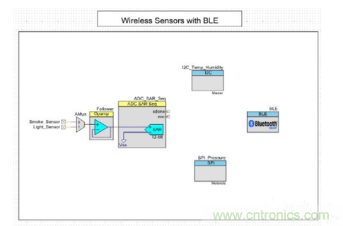 內置BLE功能的處理器的靈活性和豐富資源,使傳感器能夠與單一BLE設備連接。圖2是使用PSoC Creator的典型配置。PSoC Creator是一個用于圍繞PSoC架構開發應用程序的IDE。圖中顯示的是模擬和數字傳感器接口以及BLE子系統。該配置展示的是用于感測煙霧、光照強度、溫度、濕度和壓力的典型工業數據監測系統。配置中的每個組件都有一個關聯的應用程序編程接口(API),開發人員可根據需要訪問這些組件。每個組件還有一個與其相關的數據表對組件的可用配置進行說明。