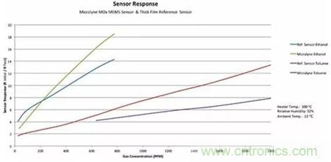 Micralyne對其MEMS MOS氣體傳感器的傳感響應,與傳統厚膜傳感器做了對比。在相對濕度32%,空氣中乙醇含量800ppm時,其MEMS MOS氣體傳感器達到和更大尺寸的厚膜傳感器(初始電阻和測試電阻比18:1)相近的靈敏度。對于所有的MOS傳感器,都必須考慮相對濕度,因為該參數也會影響傳感器的電阻變化。Micralyne的MEMS MOS氣體傳感器還可以探測600~2000 ppm的甲苯,初始電阻和測試電阻比高至8:1。其MEMS傳感器的響應時間小于1秒。并且,在氣流中移除被分析氣體后,電阻恢復速度要比傳統厚膜氣體傳感器快2倍。
