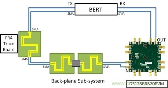 這一切聽起來很棒,但該工具能給您帶來可靠的結果嗎?為了回答這個問題,筆者去了實驗室,并進行了一些測量。筆者決定使用一個速率為12.5Gbps的Linear re-driver DS125BR820EVM、一些FR4印刷電路板(PCB)走線以及具有SMA連接器、適用于背板子系統的子卡。圖1展示了筆者的簡單設置。使用一個誤碼率測試器(BERT)作為為本次研究的發送器及接收器)。