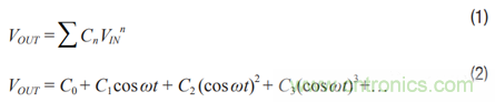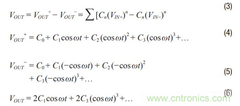 差分信號可抑制偶數階諧波。以下展示了連續波(CW)通過一個 增益模塊的示例。當使用一個單端放大器時,如圖2所示,輸出 可表示為公式1和公式2。