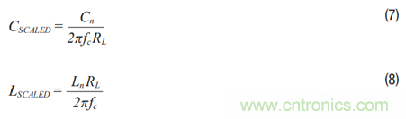 CSCALED為最終電容值。LSCALED為最終電感值。Cn為低通原型電容元件值。Ln為低通原型電感元件值。RL為最終負載電阻值。fc 為最終截止頻率。C1SCALED = 1.433/(2π × 100 × 106 × 200) = 11.4 pFL2SCALED = (1.594 × 200)/(2π × 100 × 106) = 507.4 nHC3SCALED = 11.4 pF
