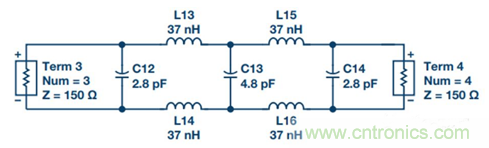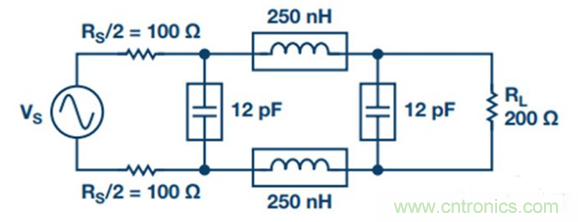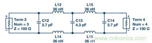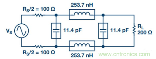 2. 將單端濾波器變為差分濾波器。源阻抗和負載阻抗保持不變,所有電容并聯,所有串聯電感減半并放在另一差分路徑中(參見圖17)。