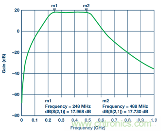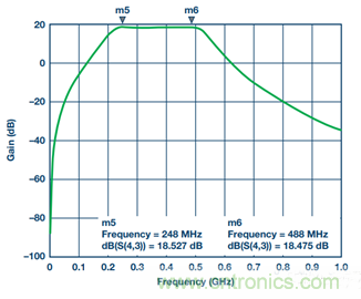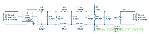 4. 對于子系統級仿真,應在輸入端增加ADL5201 DGA S參數文件,并使用壓控電壓源來模擬濾波器輸出端的 AD6641 ADC。為將低通濾波器變為帶通濾波器,增加兩個分流電感:L7與C9并聯,L8與C11并聯。C12代表AD6641輸入電容。R3和R4是放在AD6641輸入端的兩個負載電阻,用作濾波器的負載。AD6641輸入為高阻抗。調諧后的情況參見圖19。