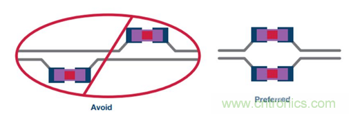 差分對布線時,應使用對稱布線(參見圖24)。若需要測試點, 應避免引入走線分支,而且測試點應對稱放置(參見圖25)。