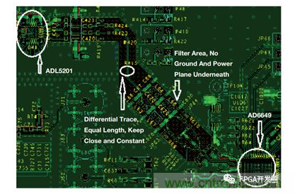 ADI公司接收器參考設計板(參見圖26)提供了差分濾波器PCB布局 的一個示例。這顯示了ADL5201和AD6649之間有一個五階濾波 器。AD6649是一款14位250 MHz流水線式ADC,具有非常好的SNR 性能。