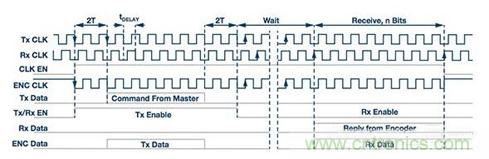 發(fā)送時鐘(Tx CLK)由處理器ADSP-CM40x產(chǎn)生。由于系統(tǒng)延遲,來自編碼器的數(shù)據(jù)在返回處理器之前會與發(fā)送時鐘錯相。為補償傳輸延遲tDELAY,處理器還會產(chǎn)生一個接收時鐘(Rx CLK),它比發(fā)送時鐘延遲tDELAY。讓接收時鐘與自從機收到的數(shù)據(jù)同相是補償傳輸延遲的有效辦法。