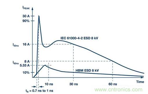 圖3. IEC 61000-4-2 ESD波形(8 kV)與HBM ESD波形(8 kV)的對比