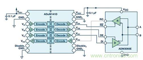 RS-485信號傳輸是平衡的差分式傳輸,本身便能抗干擾。系統(tǒng)噪聲均等地耦合到RS-485雙絞線電纜中的每條導(dǎo)線。一個信號的發(fā)射與另一個信號相反,耦合到RS-485總線的電磁場彼此抵消。這降低了系統(tǒng)的電磁干擾(EMI)。此外,ADM3065E增強的2.1 V驅(qū)動強度支持在通信中實現(xiàn)更高的信噪比(SNR)。給ADM3065E增加信號隔離可利用ADuM141D輕松實現(xiàn)。ADuM141D是一款采用ADI公司iCoupler®技術(shù)的四通道數(shù)字隔離器。ADuM141D的工作數(shù)據(jù)速率最高可達150 Mbps,因此它適合與50 Mbps ADM3065E RS-485收發(fā)器一起工作(參見圖2)。直接功率注入(DPI)法測量器件抑制注入到電源或輸入引腳的噪聲的能力。ADuM141D采用的隔離技術(shù)已通過測試,符合DPI IEC 62132-4標準。ADuM141D抗擾度性能超過同類產(chǎn)品。ADuM141D在整個頻率范圍內(nèi)保持了出色的性能,而其他隔離產(chǎn)品在200 MHz至700 MHz頻段出現(xiàn)位錯誤。