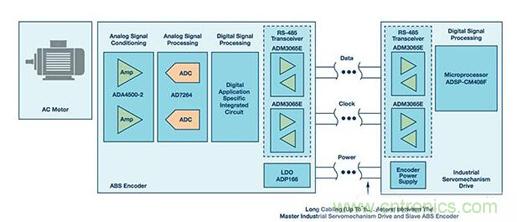 【導(dǎo)讀】旋轉(zhuǎn)編碼器廣泛用于工業(yè)自動化系統(tǒng)中。此類編碼器的典型應(yīng)用是電力機械,其中編碼器連接到旋轉(zhuǎn)軸,從而向控制系統(tǒng)提供反饋。雖然編碼器的主要用途是角度位置和速度測量,但系統(tǒng)診斷和參數(shù)配置等其他特性也很常見。圖1顯示了一個電機控制信號鏈,其利用RS-485收發(fā)器和微處理器連接絕對編碼器(ABS編碼器)從機和工業(yè)伺服驅(qū)動器主機,以實現(xiàn)對交流電機的閉環(huán)控制。