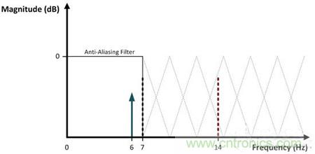 大多數(shù)ADC之前都會(huì)有一個(gè)抗混疊濾波器,而這個(gè)濾波器與衰減信號(hào)(超過了所需帶寬)的低通濾波器沒有什么不同。如圖4所示,一個(gè)理想抗混疊濾波器的響應(yīng)在那奎斯特頻率之前是絕對(duì)水平的,在這個(gè)頻率之后,它迅速滾降,以衰減帶外頻率。在這里,采樣率已加倍至14SPS,這將7Hz的那奎斯特頻率和原始6Hz輸入安全的放置在通頻帶之內(nèi)。