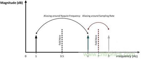 不過,你怎么能知道6Hz正弦波將會(huì)在1Hz和8Hz時(shí)出現(xiàn)混疊呢?在頻率域內(nèi)觀察混疊會(huì)使得這一點(diǎn)變得很明顯。當(dāng)使用ADC進(jìn)行采樣時(shí),輸入信號(hào)的頻率成分,從DC開始,在數(shù)倍于采樣率的頻率上重現(xiàn)。現(xiàn)在,你應(yīng)該明白術(shù)語“折返”為什么經(jīng)常被用來描述信號(hào)的混疊方式了—如果你沿著虛線將圖3折疊起來看,這些信號(hào)互相之間完美地重疊在一起。
