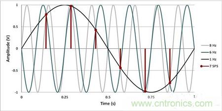 我們來看一個(gè)示例數(shù)據(jù)采樣系統(tǒng),在這個(gè)示例中,ADC以每秒7個(gè)樣本 (SPS) 的速率對(duì)6Hz輸入正弦波進(jìn)行采樣。我們得到的那奎斯特頻率為3.5Hz,對(duì)于任何一個(gè)頻率大于3.5Hz的輸入信號(hào),會(huì)產(chǎn)生原始信號(hào)的混疊。圖2顯示的是時(shí)間域內(nèi),使用6Hz原始輸入,以及其兩個(gè)混疊的情況:這兩個(gè)混疊分別為1Hz和8Hz。由于全部3個(gè)正弦波在每個(gè)采樣上相交,所以,以7SPS采樣獲得的6Hz正弦波看上去與1Hz或8Hz的正弦波沒有什么不同!當(dāng)我們查看輸出數(shù)據(jù)時(shí),混疊使我們無法將想要測(cè)量的6Hz 正弦波與它的混疊波形區(qū)分開來,并且所需要的信號(hào)內(nèi)容也丟失了。