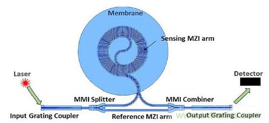 在功能上,從MZI發出的光強取決于兩個臂之間的相位差及其所承受的差壓。由于其中一個臂比另一個長得多,MZI是“不平衡的”。