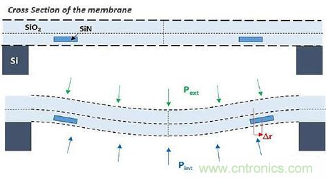 圖2:在這個微型光學壓力傳感器橫截面中,下半部分顯示了壓力下的彎曲。