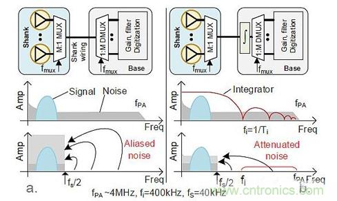 神經探針的信號帶寬約為7.5kHz,可以采用15kHz對PA輸出采樣。設計人員發現可以將時分復用技術嵌入柄中(圖4a)。這樣做可以使每個獨特的柄線上有M個PA輸出。如果沒有加抗混疊濾波器進行限制,則PA帶寬會由于折疊而產生帶內噪聲。在采樣發生之前,將低通濾波器裝入這個小PA區域是不可能的。設計人員選擇使用能夠在Ti時間段對信號進行積分的架構(圖4b)來衰減超出采樣頻率fi的信號,從而提高信噪比(SNR)。
