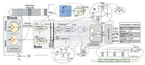 另外,目前的電子設計架構也不是最佳。探針設計由大量小型有源電極組成,用于放大和緩沖神經信號。CMOS像素放大器(PA)位于電極下方極小的空間內,由于空間不足,信號處理被迫在探針的底座完成。想象一下這種非理想信號路由中的噪聲問題,理想情況下希望信號處理緊挨著PA進行。
