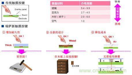相對于傳統觸摸按鍵,新的觸摸功能按鍵可以透過10mm厚度的亞克力材料或者木板進行感應,具有更加堅固的耐久性,無需使用觸摸感應彈簧。它與輕觸按鍵相比,耐久性增強,并且具有抗污防水能力,可以大大降低按鍵的錯誤率。