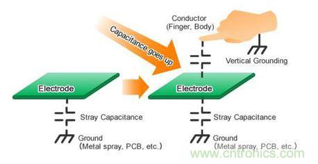 如上圖所示,為電容自感應方式,自感應方式是檢測電容量的增加,當按下鍵時,電容量將增加。潮濕的表面也會增加電容率,造成按鍵誤觸,如下圖所示。