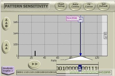 在客戶進行誤碼測試的時候,由于鏈路的損耗和芯片的輸出特性,導致出現了誤碼,但客戶卻想知道究竟是哪一個bit位出現了誤碼,以定位誤碼出現的根源。設置Bert的輸出/輸入端設置為PRBS7的碼型,在誤碼分析功能里面選擇Patten Sensitivity,則可以直接觀察PRBS7的127個比特的每一位所出現誤碼的個數,看最多誤碼所對應的比特位的前后特性,如下圖十三,移動光標到任意一個比特上面,可以看到連續多個0而中間有一個1跳變的bit即127比特的第94比特出現誤碼的個數最多,達到5043598個誤碼。從而判斷由于鏈路ISI的影響導致突然的跳變位出現較高的誤碼率。