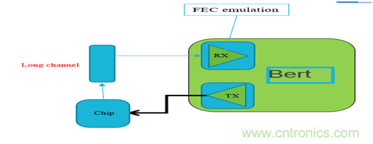 客戶的芯片的接收端可以支持FEC的糾錯功能,但要測試在不同的channel條件和不同的發送端均衡的設定下,芯片經過FEC后的誤碼率能降低到多少,如果將信號直接環回到芯片的輸入端的話,需要不停的修改芯片的FEC的參數來進行測試,但由于其芯片每修改一次FEC的參數如FEC的symbol size, block size,content size等等都需要重新對芯片進行代碼編譯和下載,每次下載需要幾分鐘的時間,由于不同的條件都要測試,則組合數量很多,導致測試效率非常低。